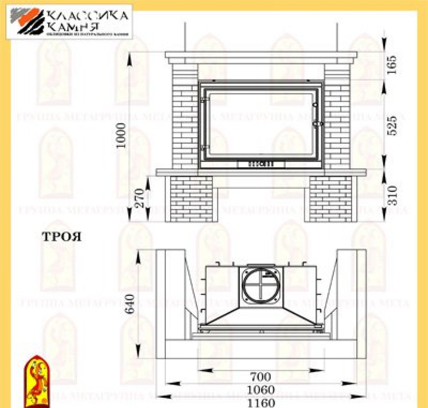 Компактная пристенная каминная облицовка Мета ТРОЯ 705 изготовлена из колотого доломита желтого цвета, натурального мрамора (бежево-серого цвета) с обработкой Антик и камня META Stone™ серо-белого цвета.
